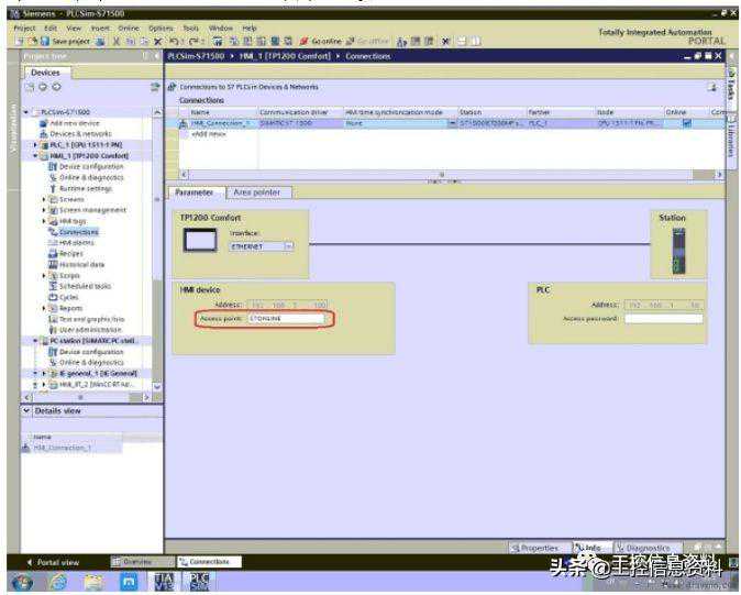 2.在TIAPortal项目中创建HMI站(BasicPanel、ComfortPanel、WinCCAdvancedStation),然后建立PLC站与HMI站的通讯连接(HMIConnection),如下图所示: