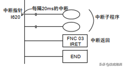 中断程序写在主程序的后面,在左母线的左边输入中断程序的编号,I1代表从这一行开始是I001中断程序(中断指令的编号是3位的,I1就是I001)结束的标准是IRET。第二段中断程序从左母线I200的符号开始,结束时到IRET。这两段中断程序都比较段只有1行程序。