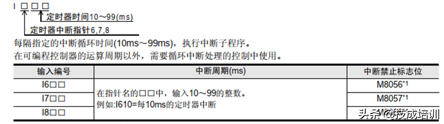 如下图的I620的中断指针,代表的是每20ms执行一次中断程序,假如是I630,那么就是30ms执行一次中断的程序,时间的设定可以从10到99ms这个时间随意设置。中断的指针编号由6、7、8这3个,时间都可以自己设定。