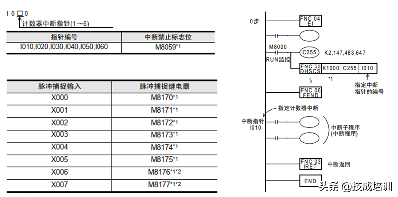 指针的编号有6个,从I010到I060,我们可以用高速计数器计算X点的脉冲数,然后通过DHSCS这一条高速中断指令进行设定,控制我们对应的中断指针执行,比如我们下图,就是计数达到1000个脉冲的时候执行中断指针I010。